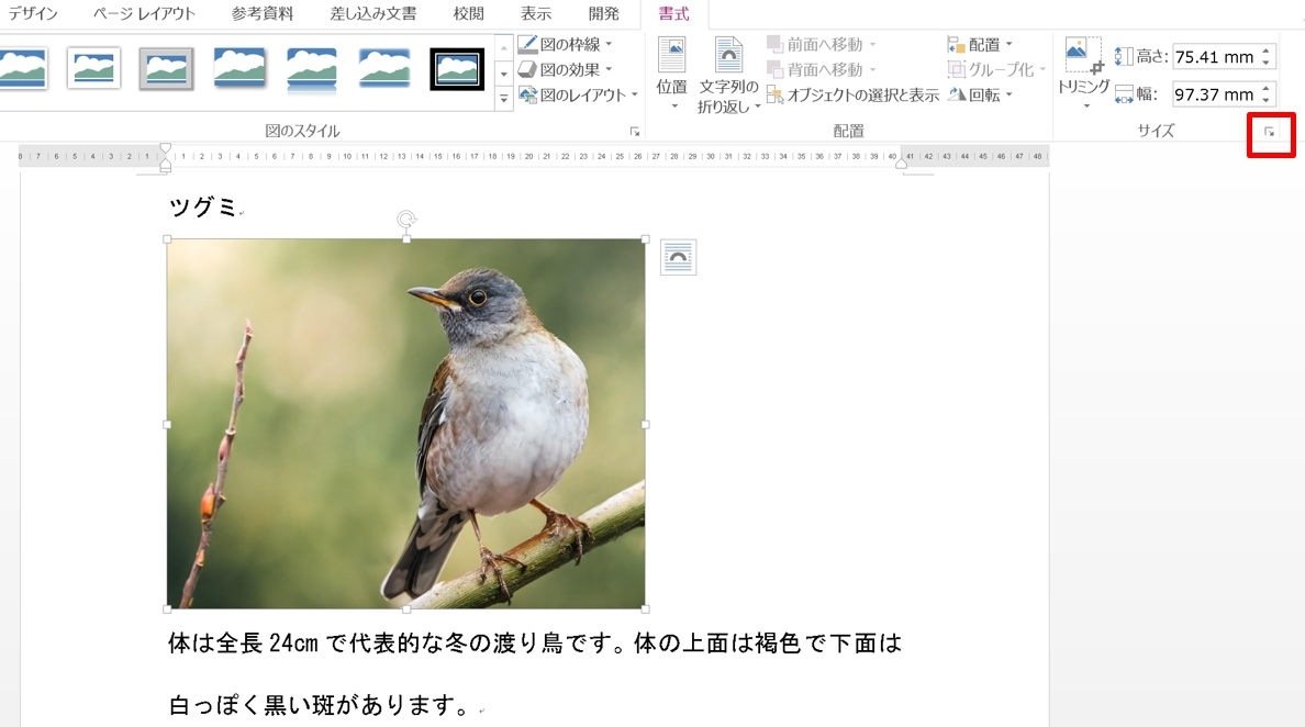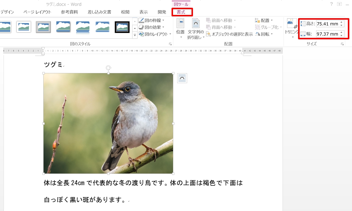 1.「図ツール」の「書式」タブをクリック→「サイズ」グループの「高さ」「幅」に変更したいサイズを入力します。ただし、ここでのサイズ変更は縦横比が固定されているので、一方のサイズを変更すると、そのサイズに比例してもう片方のサイズが変更されます。