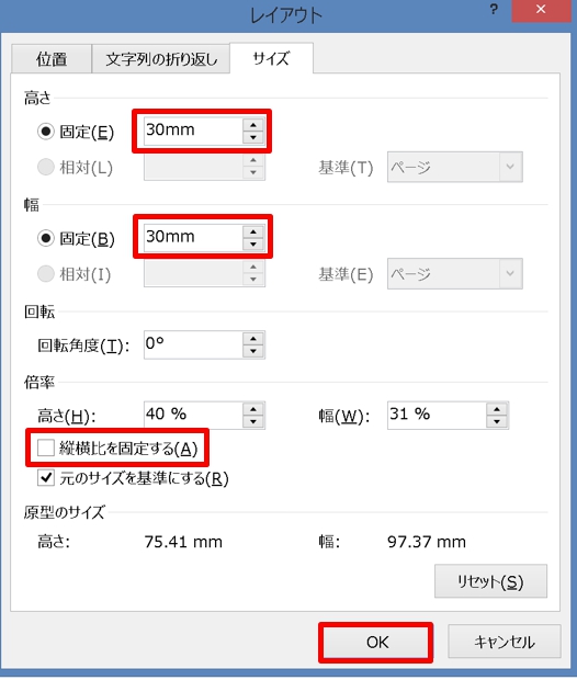 2.「レイアウト」ダイアログボックスが表示されます。ここでは、高さと幅を30mmにしてみましょう。「サイズ」タブをクリックして「縦横比を固定する」のチェックを外し、高さに「30」、幅に「30」を入力して「OK」ボタンをクリックします。