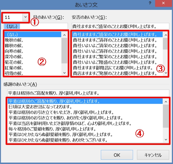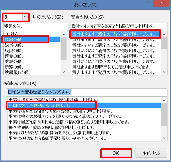 2.月を選択します。ここでは「8月」を選択しました。「月のあいさつ」「安否のあいさつ」「感謝のあいさつ」を選び、最後に「OK」をクリックします。