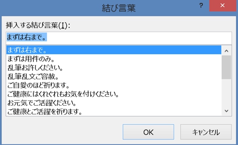 2.挿入する結び言葉を選択し、「OK」をクリックします。ここでは、「ご返事いただければ幸いです。」を選択しました。