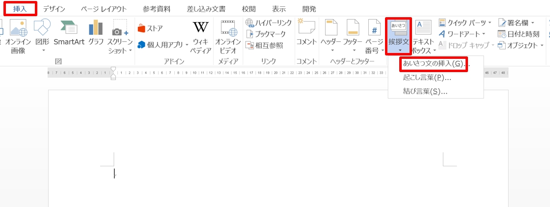 1.「挿入」タブをクリックして、「テキスト」グループの「挨拶文」をクリックします。