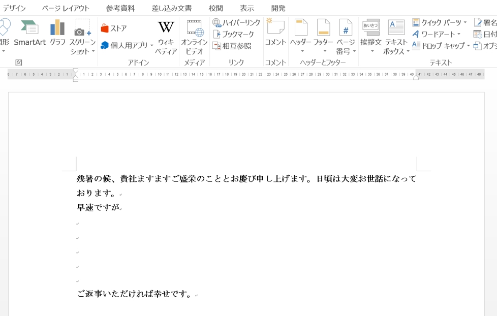 3.選択した3つ、「残暑の候、」「 貴社ますますご盛栄のこととお慶び申し上げます。」「日頃は大変お世話になっております。」が挿入されました。