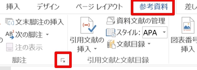 1.脚注を入れたい場所をクリックします。「参考資料」タブの「脚注」グループにある「脚注と文末脚注」ダイアログボックス起動ツールをクリックします。