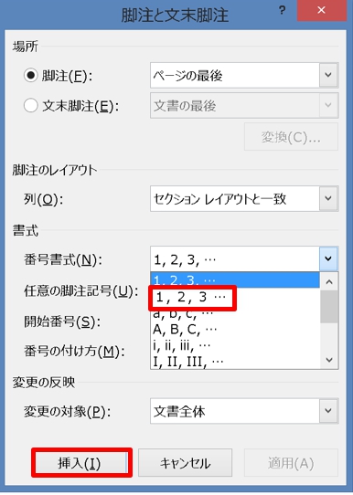 2.「脚注と文末脚注」ダイアログボックスが開くので、「番号書式」のプルダウンをクリックします。