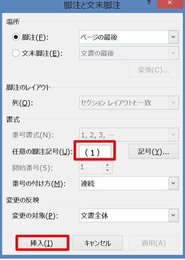 1.「脚注と文末脚注」ダイアログボックスを開きます。「任意の脚注記号」に全角で「(1)」を入力し「挿入」をクリックします。