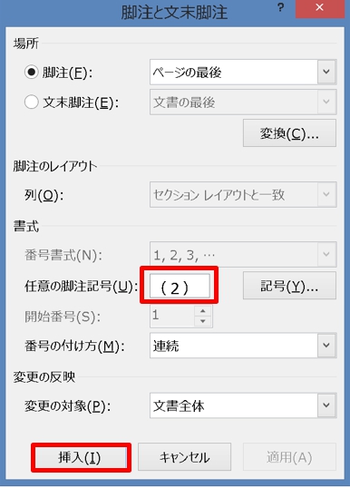 3.「脚注と文末脚注」ダイアログボックスを開くので「任意の脚注記号」に全角で「(2)」を入力し「挿入」をクリックします。