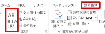 ワードで脚注を入れるには、「参考資料」タブの「脚注の挿入」をクリックします。